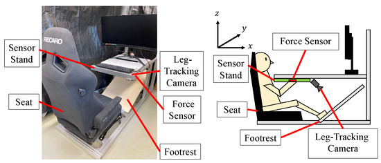 The leader system consists of an aluminum frame, and is equipped with a six-degrees-of-freedom force sensor (FFS055YA501, Leptrino Inc., Nagano, Japan) and web camera (CMS-V31SETBK, Sanwa Supply Inc., Okayama, Japan). Additionally, to create an environment that is not prone to fatigue, the leader system is equipped with a car seat suitable for long-distance driving (SR-7F KK100, Recaro Inc., Shiga, Japan). The operator sits on the chair at the center of this system and operates the robot by applying force using a grip attached to the force sensor. The camera detects the foot movement, which is used as input to operate the robot.