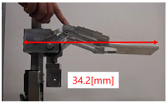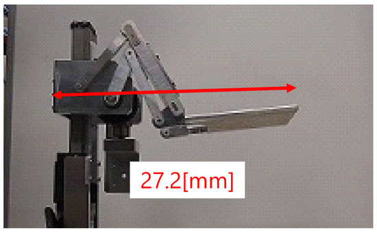 The follower robot consists of an arm unit to lift an object, a lift unit to move the arm horizontally and vertically, and a locomotion unit. A linear actuator (SKR2602AE, THK Co., Ltd., Tokyo, Japan) moves the arm vertically. A stepper motor (PKP243D15A, Oriental Motor Co., Ltd., Tokyo, Japan) extends the arm by 7 mm, as shown in Figure 5 and Figure 6. Two driving wheels are arranged on the opposing sides of the locomotion unit and connected to stepper motors (PKP233D15A, Oriental Motor Co., Ltd.). Additionally, outriggers are attached in front of the locomotive unit to prevent overturning when the robot transports heavy objects [31], and stepper motors (PKP233D15A and PKP213D05A, Oriental Motor Co., Ltd.) are used to drive them. To prevent the follower robot from colliding with obstacles such as pedestrians and walls, the locomotive unit is equipped with distance sensors (VL53L0X, Strawberry Linux Co., Ltd., Tokyo, Japan) on all sides.