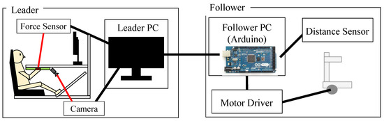 The follower robot is equipped with a microcomputer (Arduino Mega 2560 R3, Arduino, Monza e della Brianza, Italy) for the motor drivers and a distance sensor from which the relative distance and velocity of the obstacle are calculated as environmental inputs. The desired motion values are generated by the microcomputer using the operation inputs sent from the leader and the environmental inputs. Serial communication is used between the leader and the follower. The desired values of the generated motion are sent to the motor controllers. Each stepper motor has a motor driver (L6470, Strawberry Linux Co., Ltd.), and the linear actuator has a servo driver (TLC-005-024DC, THK Co., Ltd.).