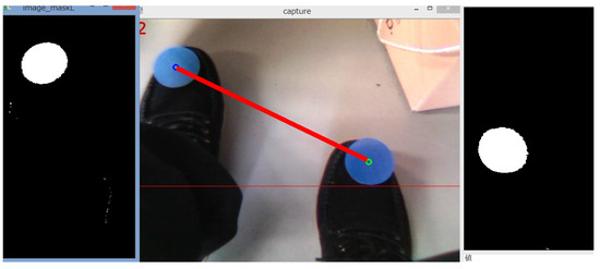 Step length calculation. The center frame shows the movement of the operator’s feet. The left and right frames show the result of the image processing of the logos on the operator’s feet which will be used to calculate the step length. The red line in the center frame means the step length.