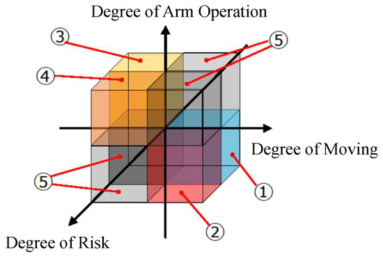 In this study, this idea was applied to create a “behavior map” to fit the potential actions of the follower robot with respect to the evaluation indices as its axes. As an example, the degrees of risk, movement (locomotive operation), and arm operation are selected as the evaluation indices and form the three axes of the behavior map, as shown in Figure 9. The degree of risk represents how dangerous it is to operate the follower robot. The reason why the degree of risk is proposed as an evaluation index is to reduce the overall burden on the operator during extended periods of work. The degree of risk is calculated based on the relative distance and relative velocity between the follower robot and the obstacle measured by distance sensors. By analyzing the value of the degree of risk, it can be judged whether the follower robot has the risk of colliding with the obstacle to ensure the safety of work. With this evaluation index, the operator does not need to constantly pay full attention to the distance sensor data, thereby reducing the overall burden on the operator during extended periods of work. Also, the degree of movement indicates whether the operator intends to perform a movement operation, and the degree of arm operation indicates whether the operator intends to operate the robot’s arm. Each evaluation index is obtained by simplified fuzzy inference, as explained in the next subsection. The three degrees are scalars ranging from −1 to 1, with the values going from negative to positive to indicate the risk intensity or the intention from weak to strong. The follower robot can perform five behaviors, as presented in Table 2. These actions are assigned to each quadrant of the behavior map to form the intended operations corresponding to the figure and table.