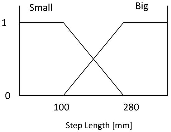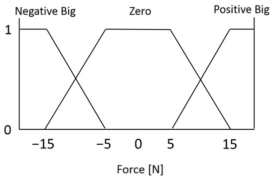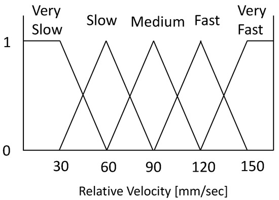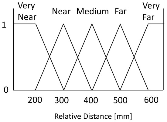 The antecedent membership functions corresponding to the relative distance, relative velocity, force, and step length are shown in Figure 10, Figure 11, Figure 12 and Figure 13. Figure 10 shows the membership functions for the relative distance as “VN (Very Near)”, “N (Near)”, “M (Medium)”, “F (Far)”, or “VF (Very Far)”. Figure 11 shows the membership functions for the relative velocity as “VSl (Very Slow)”, “Sl (Slow)”, “M (Medium)”, “F (Fast)”, or “VF (Very Fast)”. Figure 12 shows membership functions for the magnitude of the force in each direction (x-, y-, and z-axis in Figure 4) as “NB (Negative Big)”, “ZO (Zero)”, and “PB (Positive Big)”. Figure 13 shows the membership functions for the step length as “B (Big)” or “S (Small).”