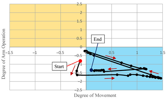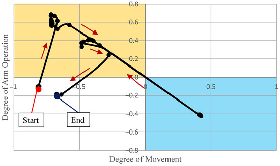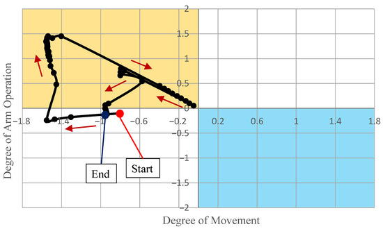 While the original intended operation was ”Move”, the actual operation input was “Stop”, “Move”, “Operate arm”, and “Move”, in this order. The locus of intention estimated without the historical values is shown in Figure 16, and that estimated with the historical values is shown in Figure 17. The second and fourth quadrants indicate “Operate arm” and “Move” in the behavior map, respectively. The first and third quadrants indicate “Stop”.