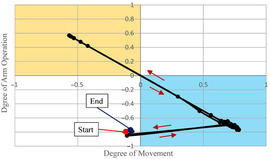 In contrast, Figure 15 shows that the estimated intention did not enter the “Move” quadrant, even when the input changed from arm operation to locomotion. Therefore, the intention estimation was modified by the historical intention values. Thus, the safety of the robot and surroundings is retained even when misoperation occurs.