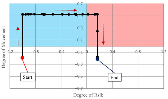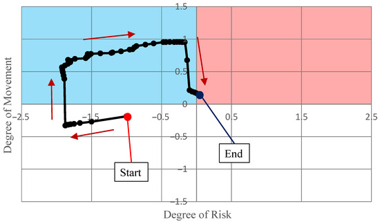 While the original intended operation was “Move”, the operation input continued to cause the follower robot to move forward although an obstacle existed in front of it. The locus of intention estimated without the historical values is shown in Figure 18, and that estimated with the historical values is shown in Figure 19. The first quadrant and second quadrant indicate “Avoid during movement”, and “Move” in the behavior map, respectively. The third and fourth quadrants indicate “Stop”.