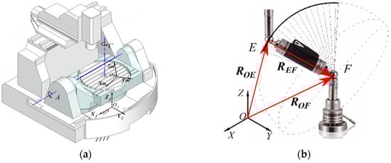 The spatial motion of the worktable can be expressed in the fixed coordinate system {Of, Xf, Yf, Zf} established on the machine tool frame, and each coordinate axis is along the corresponding machine tool linear axis direction. A moving coordinate system {Om, xm, ym, zm}, is set up on the worktable, and the axis zm is defined along the worktable rotation axis direction. A point P of the worktable can be expressed as a point vector RPf in {Of, Xf, Yf, Zf}: