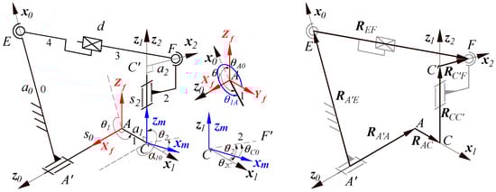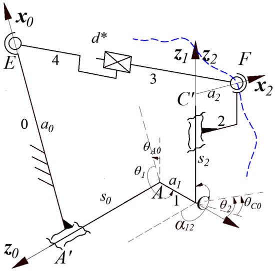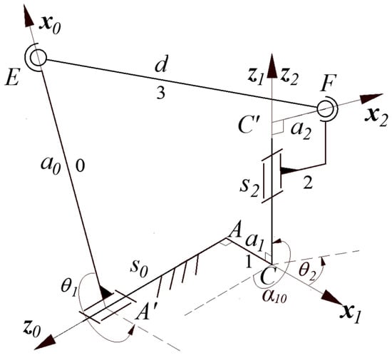 As per the Denavit–Hartenberg convention [], the coordinate systems of three components of the spatial five-bar linkage are established. These include the fixed coordinate system {A′, x0, y0, z0} for frame 0, the coordinate system {C, x1, y1, z1} for link 1, and the coordinate system {C′, x2, y2, z2} for link 2. Two ball centers point F (a2 cosθC0, a2 sinθC0, s2) and E (s0, −a0 sinθA0, a0 cosθA0) are, respectively, expressed in terms of the parameters of the linkage. A closed-loop vector equation is formulated to articulate the geometric relationships within the spatial five-bar linkage.