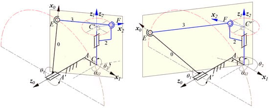 Similar to the co-linearity condition of the crank and link in a planar four-bar linkage when the planar crank-rocker linkage is at the extreme position, the spatial position relationship between crank 2, link 3, and the rotation axis z1 of the spatial four-bar linkage RRSS is discussed when rocker 0 is located at the extreme position. That is, three vectors, direction vector x1 of crank 2, direction vector z1 of its rotation axis, and vector REF of link 2, will be coplanar, as shown in Figure 4, and their inner product is zero: