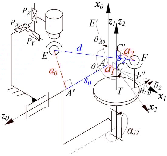 In Equation (11), θA0 and θC0 have the geometrical meanings of the installation initial angles of the spherical joints SE and SF in the coordinate system of the machine tool.