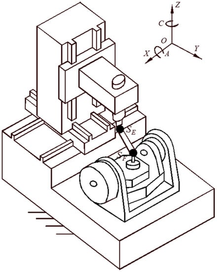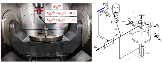 According to the above kinematic synthesis model of RRSS, by substituting the given positions (x(i)omf, y(i)omf, z(i)omf, θ1(i), θ2(i), i = 1, ……, n) into Equation (19), we can obtain the parameters (xEf, yEf, zEf, xFm, yFm, zFm, d) of RRSS. For installing two balls on the table and the spindle, the parameters of RRSS have to be transformed into the coordinate system of the machine tool, that is