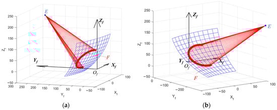 By incorporating the functional relationship between the mechanism size and θ1 and θ2 into Equation (7), we can determine the position of the fixed ball point E of the DBB and the spatial trajectory formed by the moving ball point F in the fixed coordinate system, as shown in Figure 8. The blue grid represents a spherical surface with E as the center and the nominal length d of the DBB as the radius. The trajectory of F is a spatial curve on this spherical surface. The red line represents the line connecting the moving ball points and the fixed ball point of the DBB at each moment in time.