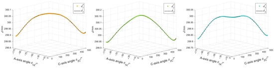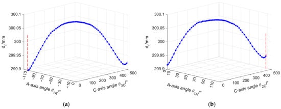 In Equation (8), there are a total of eleven parameters of the RR-SPS linkage, (s0, a0, θA0, s2, a2, θC0, a1, α12, θ1, θ2, d), in which eight ones correspond to the constructure parameters of the two-axis rotary table, one is the output parameter, while two are the input parameters. The parameters for the coordinates of the two balls’ positions are (s0, a0, θA0, s2, a2, θC0), and the constructure parameters of the A-axis and C-axis are (a1 and α12), the distance and angular between the A-axis and C-axis. The input angles θ1 and θ2 of the spatial five-bar linkage are the independent variables, and the output displacement d of the RR-SPS linkage can be solved by Equation (9). For the given parameters (s0, a0, θA0, s2, a2, θC0) of the coordinates of the two balls’ positions, the length d of the spatial five-bar linkage RR-SPS varies or outputs different values.