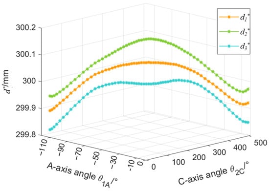 According to Equation (8), the RRSPS linkage has eight parameters: six installation position coordinates and two construction parameters. The output value d* of the DBB test reflects the total error caused by these eight parameters, which can be divided into three types: link parameter errors or installation position errors, construction errors, and kinematic pair errors caused by manufacturing. Kinematic pair errors result in error motion of the moving links with six degrees of freedom [], but this is a complex topic and is not discussed in this paper. The first two types of errors can be directly calculated by substituting the actual link lengths into Equation (8) instead of the designated values, which will correspond to the output values d* of the DBB test.
