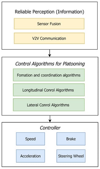 When it comes to platooning, sensor systems play crucial roles in collecting data. Multiple types of vehicle sensors, including radar, LIDAR (Light Detection and Ranging), ultrasonic, radar, optical cameras, infrared, and vision sensors, collaborate to provide a detailed, real-time image of the world around the vehicle []. These parts are essential for the safety and effectiveness of platooning because they identify possible obstructions, track vehicle attributes, and monitor the actions of neighboring road users in real time []. Sensor fusion [] is also essential for overcoming the difficult challenge of moving object recognition and tracking in autonomous vehicles.
