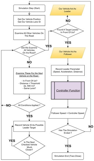 The control input function, provided by Equation (1), requires four parameters and three coefficients that have been carefully selected to ensure the best platooning performance and to maintain a smooth formation, i.e., larger values may result in automatic emergency braking, AEB, while smaller values lead toward less efficient controller algorithm, where always represents the difference between a given parameter at the leader and that of the follower. denotes the follower car’s current velocity. represents the difference in vehicles’ speeds, which is weighted by the proportional term ( was chosen to provide a reasonable response to changes in ). is the actual headway distance (difference between the front bumpers of the leader and follower), while H is the target headway distance to be achieved. We use headway and not clearance in this equation, since we are dealing with TraCI language programming, which only measures the headway but not clearance. For example, if we want to keep the clearance at 6 m, then we should add the vehicle length to it, so we can obtain the desired total headway H; now, we are able to subtract it from . In this way, the clearance was kept at 6m. The integrator part of the PID controller multiplies the difference between the target and the current distance, i.e., the term modifies the control input by eliminating the steady-state error ( was chosen to minimize steady-state errors and to maintain system stability). is the acceleration difference between the leader and follower vehicles. The derivative term of the PID controller weights so that the control input is also influenced by the acceleration difference of the vehicles. On the other hand, intends to stabilize the system response ( was chosen to reduce overshoot and improve transient response).