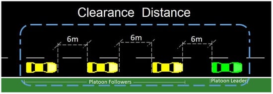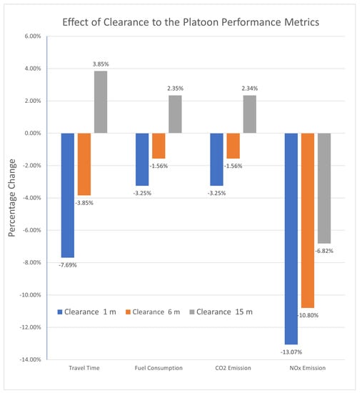 The desired safety level, traffic circumstances, and vehicle characteristics and the intended use of the platooning system all play important roles in defining the optimal clearance value for platoon formation (Figure 3). This diagram illustrates a standard platoon on the road, with the leader designated in green and the followers indicated in yellow. When setting up a platoon, the clearance parameter determines the desired clearance distance or time gap (if it is measured as time) between the leader’s tail and the follower’s front in the platoon. The clearance must ensure the safe dynamics of the platoon even in the case of sudden maneuvers, i.e., rapid braking or steering. The optimal clearance is to be adaptable depending on the traffic volume and average velocity on the given road link. For instance, bigger clearance is needed in the case of heavy traffic together with higher speed. Furthermore, the specific features of the cars (acceleration/deceleration capability or reaction time) must be considered in the platoon. Besides the vehicle-specific characteristics, the general objective of the platooning also influences the applied clearance, e.g., if traffic flow maximization is the top priority, smaller headway is preferred so that as many cars as possible may leverage the given road capacity. Furthermore, guidelines or regulations for the minimum allowable headway parameter may be provided by local legislation or industry standards in the future. Figure 4 is a result of testing platooning performance where it experiences different clearance values at 1 m, 6 m, or 15 m. So, at each clearance value, we have conducted two experiments, a controlled scenario (platooned) and non-controlled one (traditional human driving). We measured the performance metrics (travel time, fuel consumption, and CO2 and NOX emissions) in each case and then calculated the percentage change as platooning was applied. Equation (2) was used to calculate the relative change.