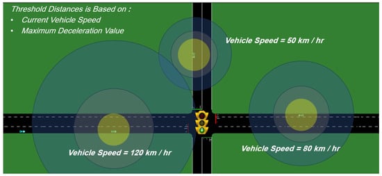The primary procedure begins with the determination of a vehicle’s distance threshold in a simulated traffic environment. As a safety measure in the event of failed V2I communication, this threshold can be utilized to ascertain whether a vehicle can completely stop before approaching a red traffic light. Distance threshold represents the safest distance a car needs to perform a full stop in case of V2I communication failure. The first step is to obtain the current vehicle motion parameters, speed, and deceleration. Figure 7 represents the threshold distance calculation based on vehicle speed.