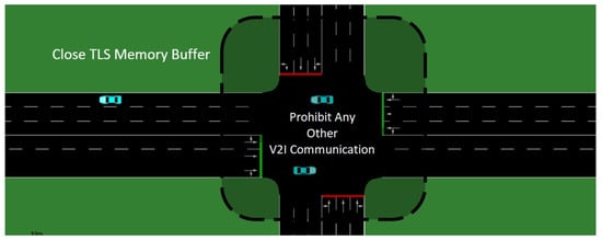 TLS memory buffer is responsible for keeping only one vehicle in an active regulator state for the traffic light, i.e., no other vehicles can control the traffic light while there is active communication between the TLS and the given vehicle (see example in Figure 9). TLS memory buffer works according to the logic as follows: