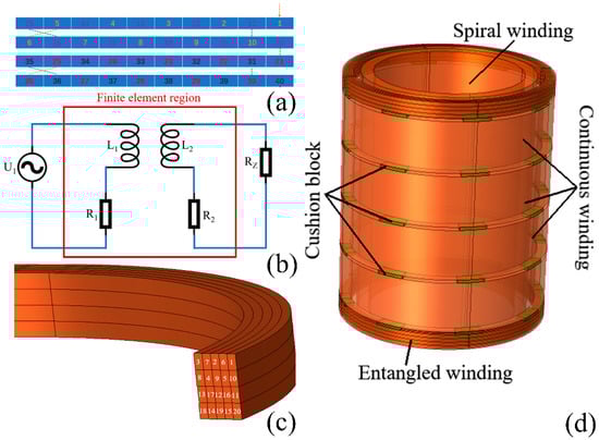 (a) Entangled winding wire turn arrangement; (b) field circuit coupling method; (c) current sequence of entangled winding; (d) winding model.