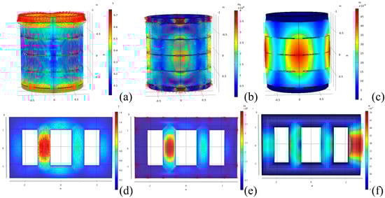 The model vibration mode of the converter transformer can reflect its inherent structural vibration form and obtain the characteristic frequency distribution of the model, independent of external excitation. In the finite element software, the converter transformer frequency domain analysis model that only considers geometry and solid mechanics is established separately, and modal calculation is carried out on the model to obtain its natural frequency and modal distribution. Table 1 lists the first six natural frequencies of the winding and iron core with significant vibration phenomena, while Figure 5 shows their respective modal distributions. When designing converter transformers, it is often necessary to consider the mode of the body to avoid resonance with the applied power during operation.