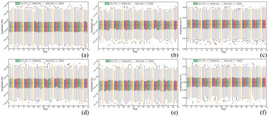 Predicted distribution box plot of core force (a), core displacement (b), core acceleration (c), winding force (d), winding displacement (e), and winding acceleration (f) during the iteration process.