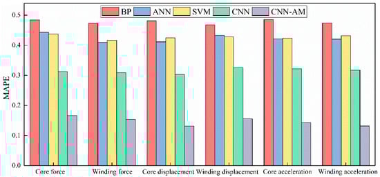 In order to further evaluate the reliability of the analysis model, the average absolute percentage errors of BP, ANN, SVM, CNN, and CNN-AM were calculated and compared, as shown in Figure 8. The relevant calculation data are summarized in Table 2. It can be seen that the average absolute percentage error of the output indicators of the BP model is very large, which is expected. Its antecedent feedback mechanism has weak ability in handling nonlinear data such as converter transformer vibration. The average absolute percentage error of CNN-AM on all six output indicators is the smallest, which is due to its advantages in handling nonlinear input-output relationships and its ability to highlight features.