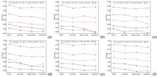 Figure 9 shows the accuracy of each prediction model under different operating conditions and similarity coefficient datasets. Figure 9a–f show the predicted results of core force, core displacement, core acceleration, winding force, winding displacement, and winding acceleration, respectively. As clearly shown in the figure, under other working conditions, the prediction accuracy of the prediction model has decreased, with ANN, SVM, and BP models showing the most significant decrease in accuracy, indicating that CNN is reasonable for predicting similar processes of converter transformers. The accuracy of the CNN-AM model slightly decreased during training on datasets under different operating conditions, but the average prediction accuracy remained above 97%, proving that the trained model has strong stability compared to other models [12]. Especially for datasets with scale coefficients greater than 1, the prediction accuracy of ANN and SVM models significantly decreases, while the prediction accuracy of CNN-AM model for six prediction parameters can still reach 96%, proving that the model has good universality [13].