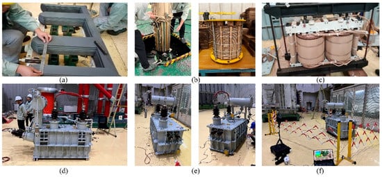 Figure 10 shows the design process of the proportional prototype converter transformer. Figure 10a–c show the assembly effect of the iron core, winding, and internal components of the scale prototype, respectively. Figure 10d–f show the overall appearance structure and testing experimental arrangement of the scale prototype. Figure 11 shows the layout of measurement points for vibration characteristic testing.