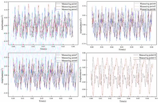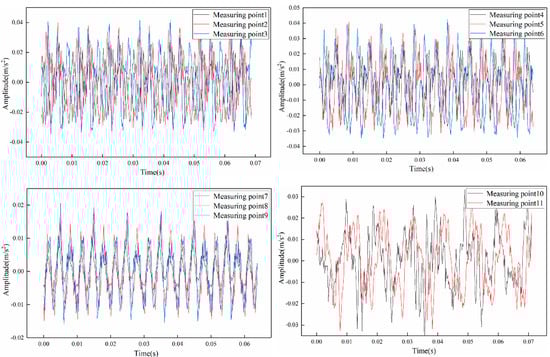 The time domain distribution of load vibration acceleration at each measuring point of the prototype is shown in Figure 13. Compared with no load, the overall amplitude of vibration signal under load condition is smaller, which is mainly related to the magnitude of excitation under load condition. The amplitude of the load vibration signal on the front tank wall is larger, while the amplitude on the side and top cover tank wall is weaker. The vibration signal at no load has certain periodicity, and its vibration period is about 0.01 s.