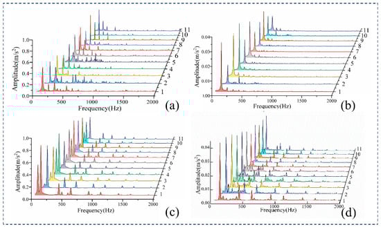 (a) Frequency domain diagram of the prototype’s no-load vibration signal; (b) Frequency domain diagram of prototype load vibration signal; (c) Frequency domain diagram of simulated no-load vibration signal; (d) Simulate the frequency domain of load vibration signals.