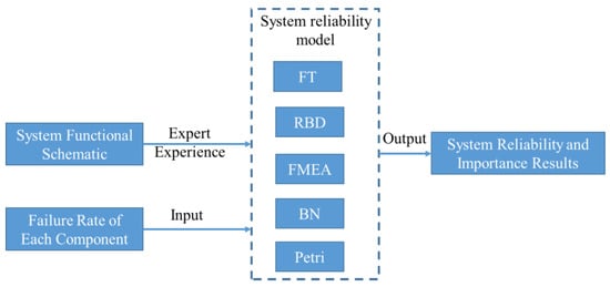 The reliability evaluation work of the system during the aircraft system optimization design process depends on a reasonable and effective reliability model [,,]. Only by establishing a correct and effective system reliability model can the system reliability be predicted and distributed, and the in-depth analysis of the effects and hazards of failure modes be carried out. Building a system reliability model is essential in reliability design [,]. Currently, fault tree analysis (FTA) [,], reliability block diagram (RBD) [,], failure mode and effect analysis (FMEA) [,], event tree (ET) [], the minimum cut set method [,], dynamic fault tree (DFT) [,], and Markov chain (MC) [,] have mature theoretical foundations. These are the primary technical means of aircraft system reliability evaluation both domestically and internationally.