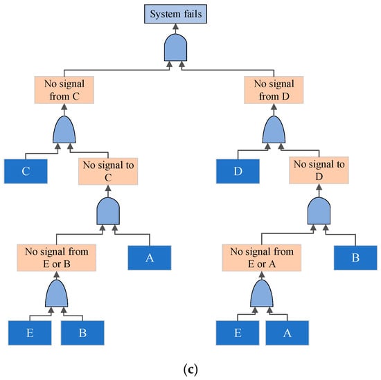 - According to the converting process from Figure 7b,c, convert nodes representing components’ normal states into nodes representing function loss states. Additionally, convert nodes representing non-physical failure states into nodes representing physical failure states. In this way, type II nodes of the system reliability model are obtained. Additionally, each logic gate expressed from a functional perspective should be converted into its equivalent logic gate with physical meaning from a fault perspective. When a type II node represents a system’s function loss state, it serves as a leaf node in the reliability model and an intermediate node if it represents a component’s function loss.