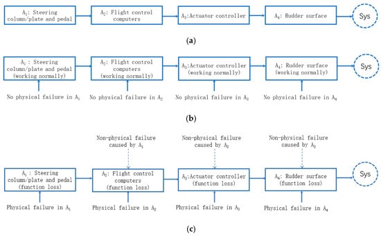 In Figure 6a, when A1 experiences a physical failure, it does not directly result in A4, the end component of the system function architecture, being unable to deflect. Rather, it leads to the loss of function in A1: the inability to issue the expected operating instructions. The loss of this function in A1 results in A2 being unable to perform its function of converting the operating instructions from A1 into the expected control command. Additionally, even if A1 were able to issue operating instructions normally, a physical failure in A2 may cause it to fail to correctly convert these instructions into the expected control command. Similarly, the loss of function in A2 and a physical failure in A3 result in A3 being unable to receive the correct control command from A2 or convert these commands into the corresponding analog quantity and actuator position signal to drive the movement of the downstream component. The loss of function in A3 and a physical failure in A4 cause A4 to fail to deflect as expected. When the end component A4 cannot deflect as expected, the system denoted by the node “Sys” is unable to complete its intended function of controlling the aircraft’s flight, indicating a failed or non-functional system.
