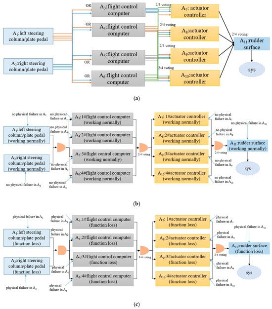 In large-scale complex system reliability modeling, modelers are easily restricted by the level of understanding and analysis. Even if the same model type is used to model the system, the models built by different modelers are likely to differ [,]. For example, for a simple system shown in Figure 3a, the fault tree can exist in two forms; see Figure 3b,c. Therefore, only when the reliability model is consistent with the system function architecture as highly as possible can the objective facts of the system be described to the greatest extent to avoid mistakes caused by too many human subjective factors and ensure the correctness of the model.