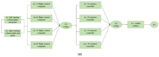 The system is typically designed in the function space by a design specialist. As such, the logical relationship between a downstream component and its multiple upstream components must be expressed from a functional perspective. For instance, the “2/4 Voting” logic in Figure 7 indicates that among the four upstream components, only when at least two of them can normally output their function can the downstream component perform its function. However, in the fault space, the logical relationship among components in the upstream and downstream is expressed from the perspective of fault propagation path. Therefore, when converting the system architecture to a system reliability model, which is always depicted in the fault space, the functional logic in the architecture must be converted into the equivalent fault logic. This means that the “2/4 Voting” logic in Figure 7b should be converted into the “3/4 Voting” logic in Figure 7c when building a system reliability model. This means that among the four upstream components, only when at least three of them output their function abnormally can the downstream component lose its function. Although the “2/4 Voting” logic in Figure 7b and “3/4 Voting” logic in Figure 7c are depicted from different perspectives, their physical meanings are essentially the same. Similarly, the “AND” and “OR” logic in the function space are equivalent to the “OR” and “AND” logic in the fault space, respectively.