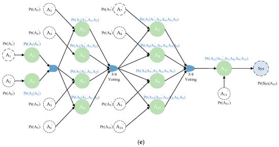 The reliability models of the system constructed in different methods are shown in Figure 8. The RBD and FTA modeling methods can be referenced from Refs. [,], which are used for the model construction of Figure 8a,c. The conversion method from FTA and RBD to the equivalent BN can be referenced from as Refs. [,], which is used to transform the models in Figure 8a,c into the models in Figure 8b,d, separately.