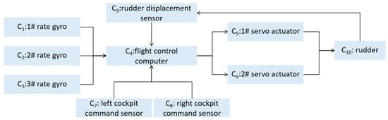 The function architecture of an aircraft flight control system through fly-by-wire technology is depicted in Figure 9. The system consists of ten components: three rate gyros, one flight control computer, two servo actuators, one left cockpit command sensor, one right cockpit command sensor, one rudder displacement sensor, and a rudder surface.