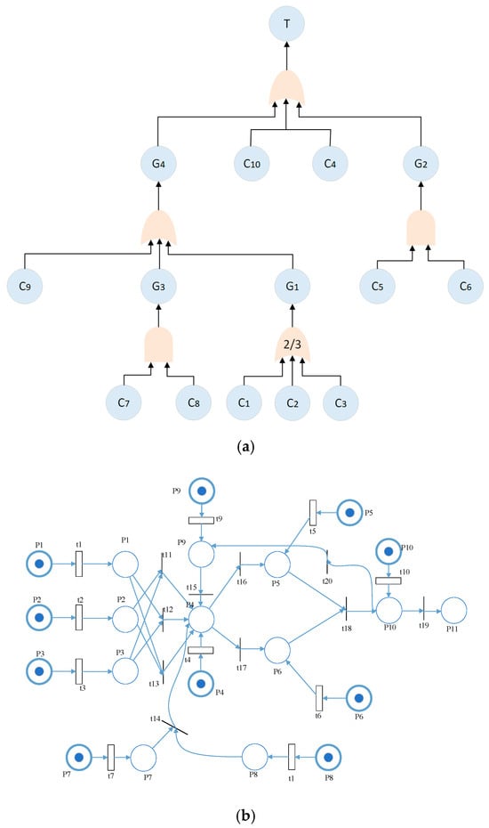 Firstly, the fault tree analysis method calculates the model in Figure 10a. The system reliability at time is calculated as Equations (3)–(7).