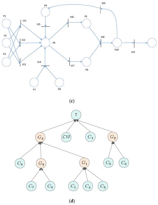 The three-state space model constructed using the proposed method is shown in Figure 10b, where Pi represents the ith component in the system, the bold Pi represents the normal working state of the component, the non-bold Pi represents the failure state of a component, transitions t1-t10 represent the fault evolution process of component i from the normal state to the failure state, and transitions t11–t20 represent the fault propagation relationship among components, shown in Figure 10c. These transitions correctly reflect the equivalent transformation of the system from the function space to the failure space. For example, transitions t11, t12, and t13 represent when at least two of the three rate gyros in P1, P2, and P3 fail. The flight control computer cannot receive the aircraft’s rate data, which is consistent with the functional description “When at least two of the three rate gyros are working normally, the flight control computer can receive the aircraft’s rate data”.