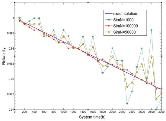 SimN is the simulation times, and the array SYS[SimN] records the failure time of the system in each simulation process, where Sim_n = 1, 2…SimN. The results obtained using the three-state space model in GSPN language with Monte Carlo simulation at SimN = 1000, 50,000 and 100,000 are given in the fourth-sixth column of Table 4, and the results at different SimN are also given in Figure 11.
