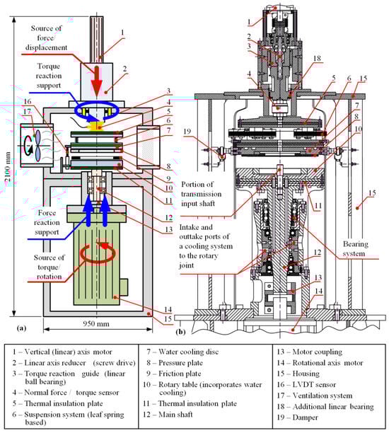 As outlined in Section 2.1, the tribometer comprises two servo axes: rotating and linear ones (see Figure 1). The pressure plate (8) is carried by the vertical axis as a source of variable normal load. The connection is realized directly through a precise, stiff, and compact normal force and torque piezoelectric sensor (4), thus, preventing any parallel (typically friction loss) force/torque transfer paths that would affect the measurement accuracy. The friction interface temperature is measured by a Pt100 sensor probe installed into the pressure plate (8) at its effective radius and the axial distance from the friction contact surface of 4 mm. The vertical axis is driven by a servomotor (1) (2.15 Nm @ 3000 rpm, max. 10 Nm) and a high-ratio screw-drive reducer (2) (1 mm/rev). The friction forces generated between the pressure plate (8) and the friction plate (9) act via a cantilever on the screw drive generating both the torsional and bending torque load. The torque reaction support system (3) (a linear ball bearing) is incorporated as an integral part of the vertical servo-axis (Figure 1b), and an additional linear bearing (18) is placed above the force/torque sensor to prevent transfer of the bending torque loads to the screw drive.