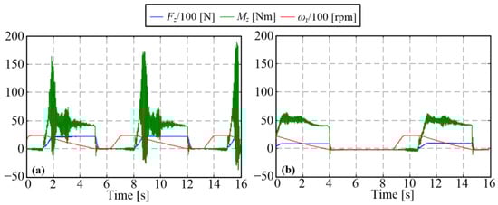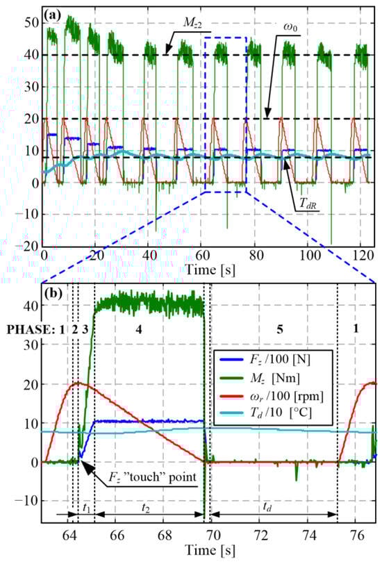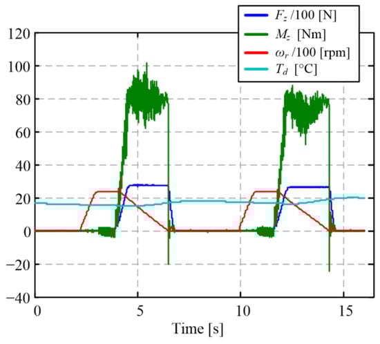 The torque Mz (or normal force Fz), slip speed (ωr), temperature (Td), and closing time (t2) are accurately controlled via feedback regulators acting through rotational- and vertical-axis servodrives and the water-cooling system (see Table 1 and time responses in Figure 2). Apart from imposing a delay (td) between two consecutive clutch closing cycles, the pressure plate temperature is controlled by varying the cooling pump speed and manipulating an on/off valve that can bypass the coolant flow around the pressure plate. The torque control system is realized in a cascade structure comprising a superimposed integral (I)-type torque controller, an inner proportional (P)-type normal force controller, and a most-inner proportional-integral (PI) vertical axis motor speed controller. The closing time is controlled by means of “electrical inertia”, implemented through an integral type closing time controller, which commands the electric inertia ratio used to calculate the rotational axis servomotor torque reference from the measured friction interface torque. A detailed elaboration on the control system design is given in [17].