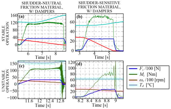 Examples of stable and unstable operation of tribometer with installed dampers for shudder-neutral (a,c) and shudder-sensitive friction materials (b,d) under high-torque and high-speed conditions.