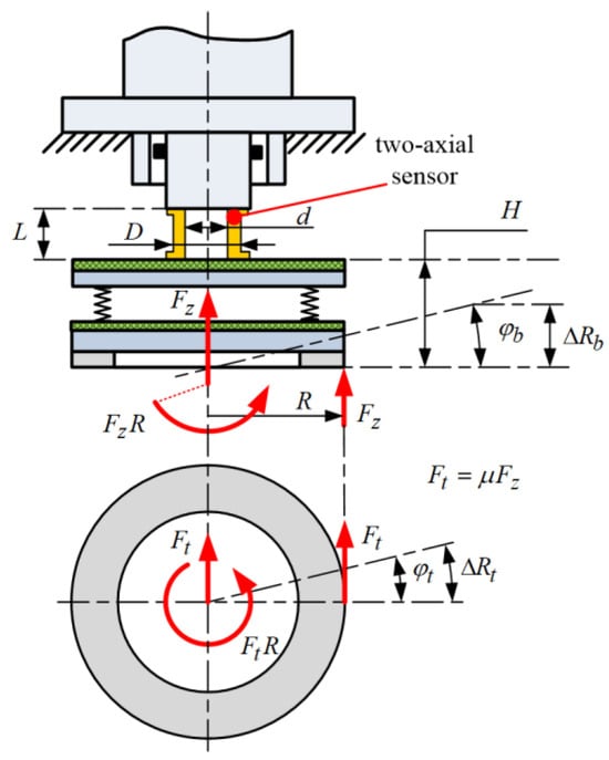 A simplified static model of the vertical axis is shown in Figure 4. In the case of the occurrence of eccentric normal force (Fz), the corresponding eccentric lateral friction forces occur, which depends on the eccentric normal force and the coefficient of friction (μ), i.e., Ft = μ ∙ Fz. The installed two-axial sensor is subjected to the normal force and the friction torque (Mz) acting on the central axis: