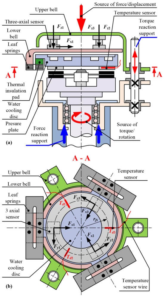 A functional schematic of the redesigned tribometer machine is shown in Figure 5. All the proposed changes are implemented without changing the key aspects of the original design. In particular, the cooling disc is still mechanically connected solely to the lower bell via leaf springs. The lower bell is then connected to the upper bell via the torque/force measurement system. Thus, all forces occurring in the friction contact are transferred and measured by the sensor, i.e., a parasitic parallel transfer of force does not exist (note that the dampers to the housing are not installed anymore).