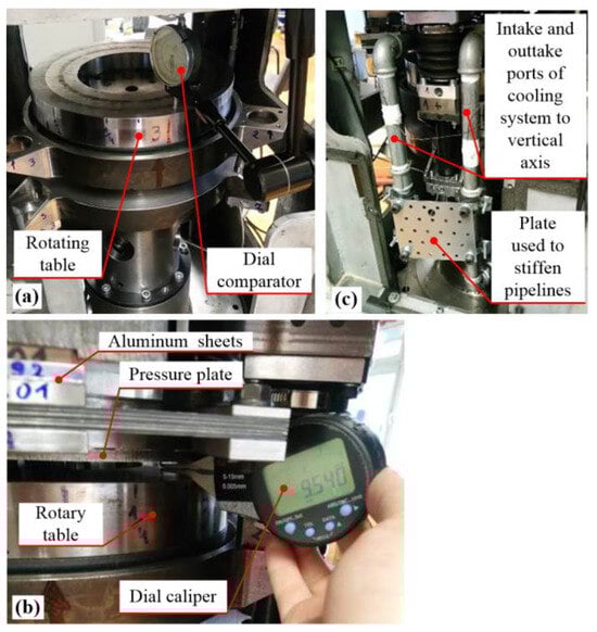 Illustration of the adjustments of the orthogonality of the rotary table vertical axis to its top surface (a) and rotary table-to-pressure plate parallelism (b), and increase in stiffness of cooling fluid pipelines (c).