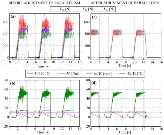 The rotary table-to-pressure plate parallelism was achieved by equalizing the normal force/pressure around the circumference of the friction plane. This is feasible for the redesigned tribometer since it provides the measurement of the individual circumferential normal forces (Figure 8b). Based on the analysis presented in Section 2, achieving the parallelism of friction surfaces is one of the key measures towards suppressing the shudder vibrations, because (i) the eccentric normal force and, thus, the eccentric lateral forces and the bending torque would be minimized, and (ii) the hot spots in the friction interface would be suppressed, thus, minimizing the variation in friction coefficient and generation of the corresponding lateral forces. The latter is also beneficial from the perspective of achieving regular, uniform wear conditions.