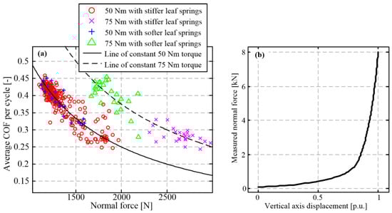 Closing cycle-average COF vs. normal force for two torque levels, initial slip speed of 2800 rpm and two leaf spring stiffness values (a), and friction plate wave spring stress–strain characteristic (b).