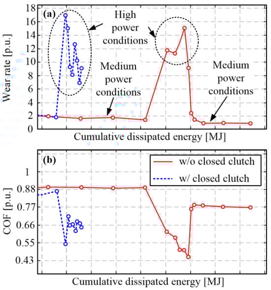 The significant drop in COF and the corresponding substantial increase in wear rate typically occur during fading conditions, which are linked to high temperatures (300 °C in [22] or even above 450 °C according to [23], depending on friction material). The temperature level used in the characterization experiment in Figure 13 equals 0.7 Td,high, where Td,high denotes the maximum temperature expected during regular clutch exploitation and is used in [24] as a basis for test-result normalization. It is worth mentioning that the fading effect for the given friction material was detected at the temperature level of 1.8 Td,high [24]. Therefore, it was reasoned, based on the connection between COF and the leaf spring stiffness observed in Figure 11a, that the remaining friction plate–pressure plate non-parallelism under the rush conditions of numerous consecutive high-power closing cycles may result in the local high-pressure regions, i.e., local high temperatures and corresponding local fading-like effects, which are non-detectable by the corresponding measurement equipment. Under the circumstances of exhausted mechanical adjustment measures, the control routines were further adjusted in order to make the thermal conditions more uniform over the whole friction surface area, thus, avoiding the friction surfaces non-parallelism under severe dynamic conditions and the corresponding local fading-like effects (see next subsections).