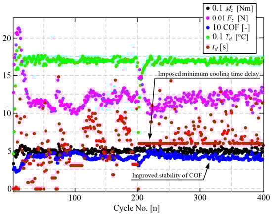 Based on the above hypothesis, the control routine was adjusted to impose a minimum cooling delay larger than zero, where the value of the lower cooling delay limit is set dependent on the operating point parameters (higher value for higher power; [24]). The second part of the response shown in Figure 14 (n ≥ 200), which corresponds to the application of a lower cooling delay of 7 s, points to a significantly more stable (stiffer) COF response compared to that of the original, unconstrained case (n < 200). It is worth mentioning that applying the non-zero minimum cooling delay prolongs the total closing cycle duration and, thus, the wear test duration. However, as the effect is predominantly connected with the initial heating (warm-up) phase, the overall duration of wear tests was found to be increased by only 5 to 10% compared to the original tests from [17].